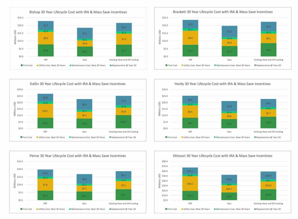 The Town of Arlington, Massachusetts issued a Request for Proposal (RFP) to contract services to develop a plan to electrify and improve air quality at six elementary schools. Engineering firm CMTA developed a plan informed by an LCCA and found that ground-source heat pumps were the most affordable HVAC option at all schools.